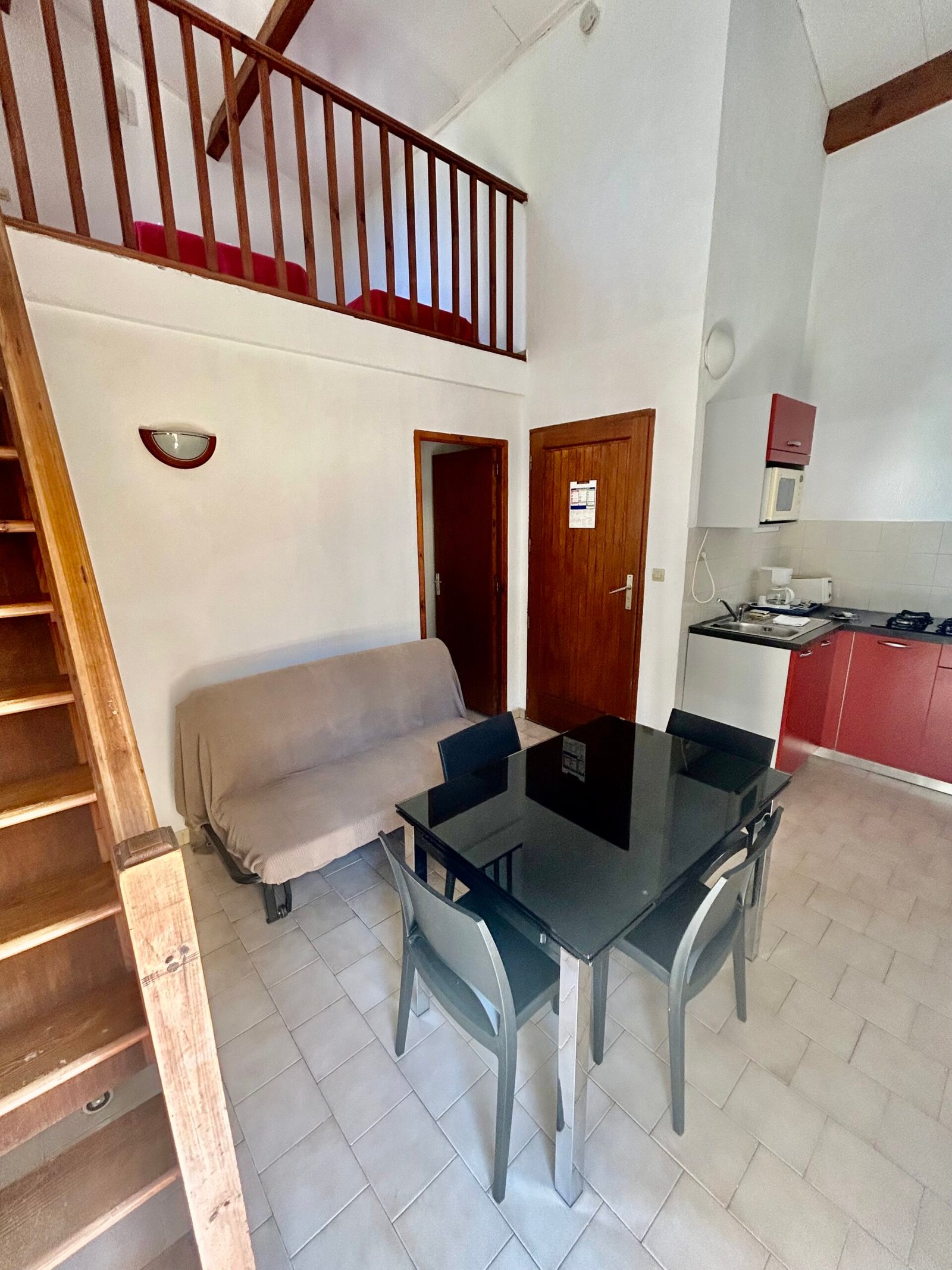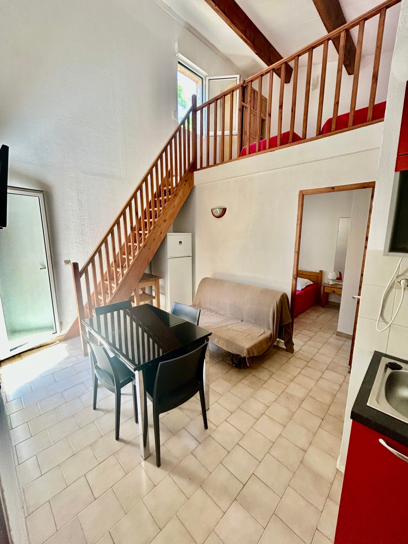 Ein 35 m² großes Apartment im klassischen Design, bestehend aus zwei Zimmern auf zwei Ebenen: im Erdgeschoss ein Wohnzimmer mit Doppelschlafcouch, Esstisch, Fernseher, Kochnische (4 Kochplatten, Mikrowelle, elektrische Kaffeemaschine), Klimaanlage, eine 6 m² große Terrasse mit der Möglichkeit, Ihre Mahlzeiten einzunehmen, WLAN, Dusche/WC, ein Schlafzimmer mit Doppelbett und ein Zwischengeschoss mit zwei Betten.